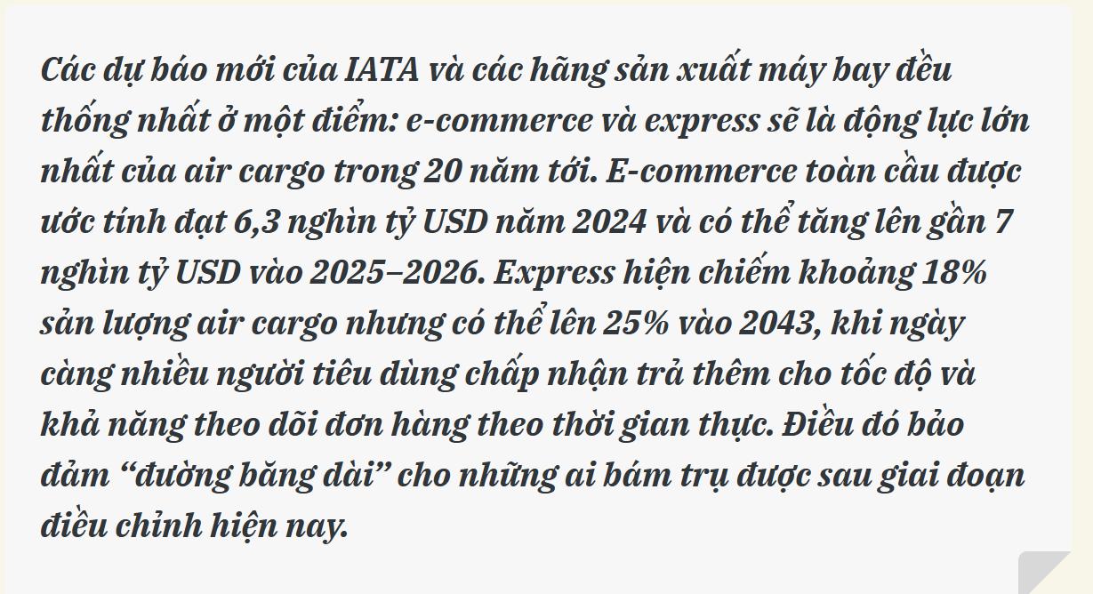 Dù tăng trưởng chậm lại ở một số tuyến, e-commerce vẫn được xem là động lực dài hạn cho ngành. Báo cáo của IATA về tương lai cơ sở hạ tầng air cargo nhấn mạnh: các lô hàng liên quan đến thương mại điện tử có thể tăng bình quân 14% mỗi năm tới 2026, buộc sân bay và hãng bay phải tái thiết kế nhà ga, áp dụng tự động hóa, robot phân loại, và xử lý dữ liệu thời gian thực. Một phân tích khác cho thấy phân khúc express dự kiến chiếm tới 25% tổng sản lượng air cargo vào năm 2043, tăng từ mức khoảng 18% hiện nay phần lớn nhờ nhu cầu phân phối e-commerce.